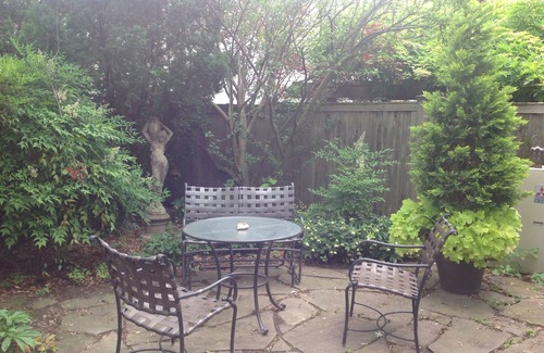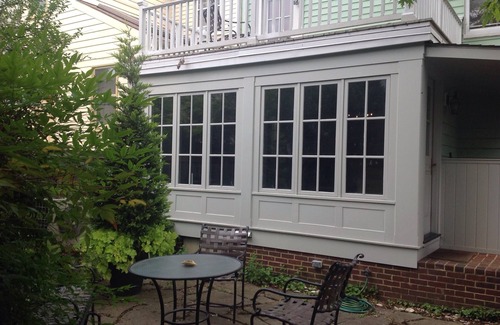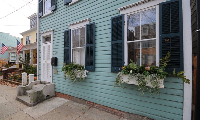 This three story 1875 home is located in the Heart of Historic Annapolis. Shops, restaurants, historic sites and the City Dock are within blocks of the front door. The Main Gate of Naval Academy is just a one block walk and St John’s College is 3 blocks from the house. This 5 bedroom, 3 bathroom home can sleep up to 12. In addition to the sleeping quarters, guests have use of a kitchen, living room, dining room, sun room, sitting room, laundry facilities, and a second floor deck overlooking the courtyard garden with grill.