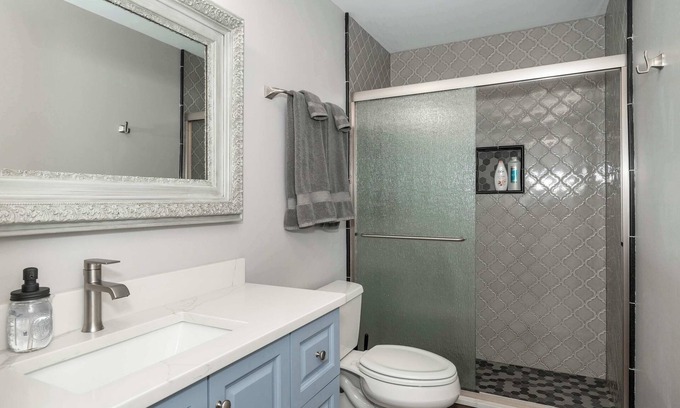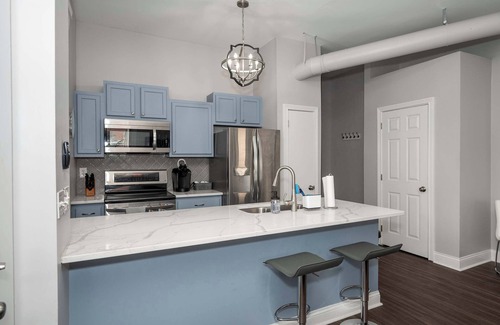 Inside the home, the open concept living area is furnished and decorated in modern greys and a signature shade of blue. A large sectional couch defines the living area which also has a large smart tv, coffee table, and accent chair. Adjacent is the modern kitchen with stainless steel appliances, spacious countertops, and eye-catching blue cabinetry. 2 barstools are arranged at the kitchen counter for casual dining, and for more formal meals, the dining table with seating for 2 awaits.