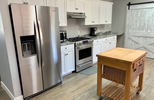 Amenities include fully-equipped kitchen with coffee, tea, creamer and sugar, spices, gas BBQ grill with utensils; in home full size washer and dryer with laundry detergent; complimentary shampoo/conditioner/body wash; 4 smart TVs; free high-speed Wifi; linens, towels, central air conditioning and heat; free parking.