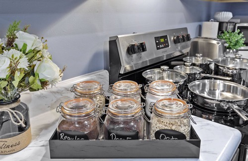 Why not take the comfort level up a notch and slip into the cozy ambience of the living room, complete with a cushy sofa, a fuzzy carpet and an enormous 55-inch 4K HDTV! All your favorite streaming services including HBO Max, Netflix, Disney +, Amazon Prime and more are available for your entertainment. Need some quality rest and relaxation? No problem! Our bedroom has abundant space for The apartment is ideally suited for couples, business travellers or solo travellers and can comfortably accommodate up to 3 guests. Inside the property, you will find a glamorous open concept living space with plenty of windows illuminating the space and gorgeous modern decorations designed to make you feel right at home. Just past the living room, you will find the kitchen, containing ample space for anyone who wishes to dine in and fire up their culinary skills. There is plenty of overhead and lower cabinet space filled with all the amenities you need to cook a wholesome meal – including cookware, silverware, glasses, plates, and pots & pans. Also, start your day off with a warm cup of perfectly brewed tea/coffee using our complementary coffee machine.