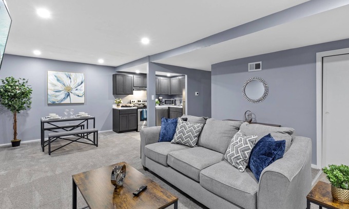 Why not take the comfort level up a notch and slip into the cozy ambience of the living room, complete with a cushy sofa, a fuzzy carpet and an enormous 55-inch 4K HDTV! All your favorite streaming services including HBO Max, Netflix, Disney +, Amazon Prime and more are available for your entertainment. Need some quality rest and relaxation? No problem! Each bedroom has abundant space for you to store your belongings, as well as a comfortable King/Queen-sized mattress with hotel-quality linens & pillows designed for maximum comfort. Additionally, benefit from using our bedside nightstand complete with a reading lamp to facilitate an ideal reading set up. After a day of adventure, wash off in a nice bubbly bath or hot shower in one our sparkling bathroom, fully equipped with towels and toiletries for your convenience.