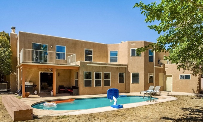 Discover your dream getaway in our enchanting 8BR, 4.5BA Modern Southwestern Style Pool home in Albuquerque. With just a 10 Minute Drive to the Balloon Fiesta Park, and 15 Minutes from the Sandia Tramway, Downtown, Old Town, Nob Hill, and UNM, this pet-friendly retreat offers the perfect setting for lasting memories with family and friends. Enjoy fun by your own private pool, indulge in the game room, or venture out to explore the local attractions. Your unforgettable vacation starts here!