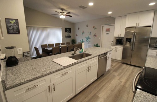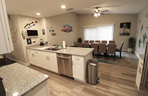 Welcome to Crystal Beach Sands in Palm Harbor, located just 1/2 a mile from Crystal Beach and minutes from Sponge Docks, This home is the perfect family vacation home. It is fully stocked and features a game room equipped with a pool table, air hockey, two retro arcade games & board games. Spacious living area for the family to relax. The pet-friendly house also has a lanai-covered Heated Pool with plenty of lounge chairs and a dining table near the grill area.