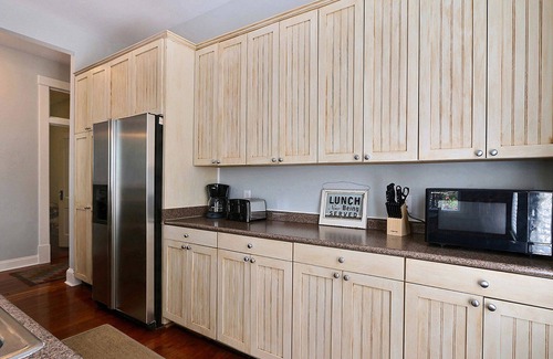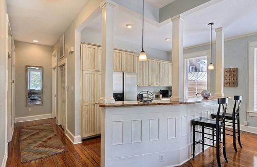 Newly refurbished and ready for guests, Lafayette Row Unit One has ample space for up to six occupants in its three-bedroom, two-bathroom accommodations. When you first walk into the front door, polished wood floors convey a sense of welcoming warmth while the open floor plan suggests expansive relaxation. Greek Revival-style columns provide decorative accents and delineate divisions between the living room, dining room and kitchen. Graceful curves define the eating bar and hallway, mirroring the bay window across the room. A rich wood mantle frames the adjacent fireplace.
