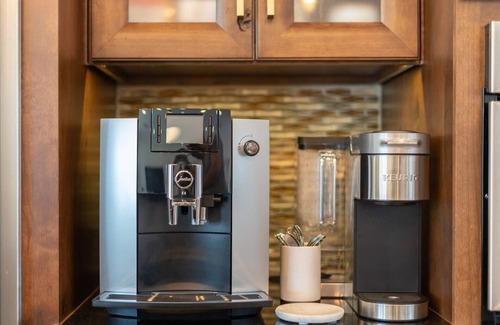 The chef's kitchen opens to a spacious great room with two seating areas and an island bar. There are two ensuite bedrooms and two additional bedrooms with multiple beds. An office space with a pullout sofa bed accommodates extra guests.