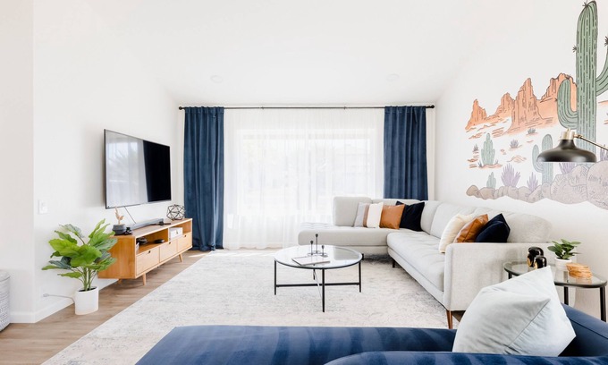 Casa Rica AZ offers a remarkable vacation experience in a designer-appointed modern home that perfectly blends style and comfort. Immerse yourself in the beauty of contemporary furnishings and a hint of southwest charm. The open-concept floor plan provides a spacious and elegant environment for you and your group to enjoy. With high ceilings and abundant natural light, you'll feel right at home.