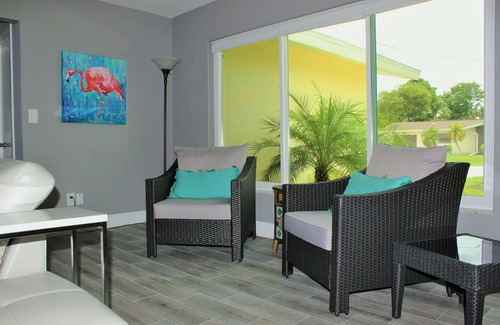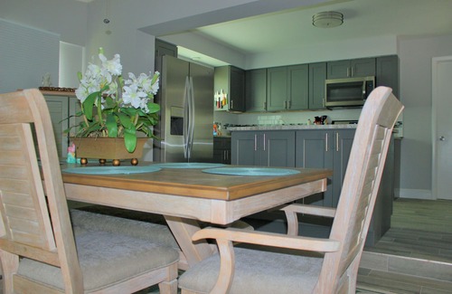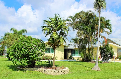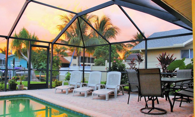 For the discriminate vacation seeking adult or business person who enjoys luxury in a quality island style setting on the mainland, this 1300 sq. ft. home was totally up fitted with new paint in 2022, hygienic tile throughout, all new cabinetry, appliances, and granite counter tops in 2017. The master bedroom with a King-sized bed has a dresser and double closets for your luggage and clothes, and shower with double vanity sinks. The cute second bedroom has a Queen-sized bed, also with a dresser and full closet. The hall bath has a tub and full vanity. Both beds have memory foam dream mattresses. More than adequate sheets, linens, towels are supplied and can be maintained with washer and dryer in the garage. Some laundry detergent and softener may be left over, but you must provide these on your own for the duration of your stay. The fully equipped kitchen is ready for your home prepared meals served on a 6 place table directly adjacent from which you can view the pool and canal. A coffee bar/eat up counter with Keurig or conventional coffee maker is also in the kitchen for morning coffee or those quick snacks from which you can see the TV. The comfortably appointed living area has a wall-mounted 55 inch LG "smart tv" with hard-wired DVD player. If you have an Iphone or Ipad, you can cast Amazon, Netflix or other viewing content directly to it with your account information (don't forget to bring it with you). It is also capable of streaming from wifi which is available and free. Additionally the TV is connected to a local amplified HD-TV antenna in order to receive all local live-TV-stations in best possible HD quality. The living area opens through triple stacking sliding doors to the screened terrace and 87 degree electric heated pool. On the screened lanai are sunning chairs, a four-place outdoor table, and a gas grill for those BBQ cooked dishes. This is also the only area smoking is allowed. Two basic bicycles can be used to explore the local area although helmets nor locks are provided. The dock and canal are accessible via a walkway from the lanai and make it easy to use your boat or a rental boat. The gulf waterway is a 10 minute boat ride (no bridges!) through the canals passing by beautiful waterfront properties to the Gulf waterway. Take your rental boat and explore over 400 miles of canals in Cape Coral or take the boat to one of many waterfront restaurants and islands in the area.