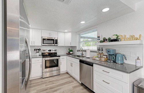 ►Fully-stocked kitchen. Featuring lots of countertop space, oven/stove, toaster, blender, dishwasher, refrigerator and microwave. All general kitchenware, dining ware, spices, cooking oil, sugar, flour, vinegar are available for your home-cooked meal. Coffee and tea bar.
