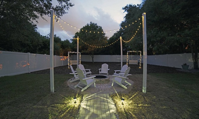 Backyard: Large vinyl fenced in backyard, fire pit with 6 Adirondack chairs (1 Duraflame provided in kitchen per stay). 2 bench swings with solar string lights that automatically turn on at night. 2 Nintendo corn holes in mulch area.