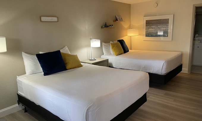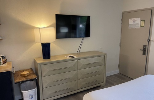 All-New, Ground Floor, Hotel Room-Condo at the Ramada Inn on 41. Ground-floor, Two large, Comfy Queen beds, Smart TV w/ cable channels, strong WIFI. All-New Shower, Vanity, Coffee/Tea bar w/ fridge and microwave. Heated Pool, gym access, Tiki Bar and Grill with daily meal and drink specials. Live music too! Beautiful Marina steps from your door...Bring your boat or rent one! Minutes drive to SRQ airport, USF, New College, IMG Academy, Downtown Sarasota, St. Armand's Circle & All area beaches!