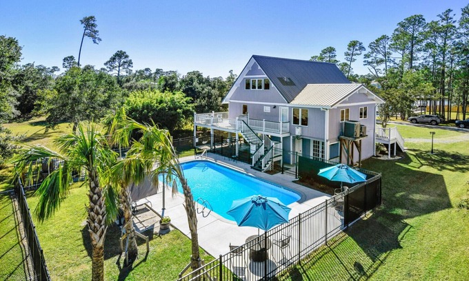 Nature's bounty surrounds this magical home. The heated 8-foot deep pool is surrounded by several seating areas and a grassy area with a shade canopy. The pool house is filled with water toys, games, and floaties for endless fun. There is an additional lounge area under the deck with bar, grill, picnic tables, hanging chairs, and a pool area bathroom. Other games and activities include darts, frisbee golf, and mother nature. Plus, Petite Retreat is just a little over a mile from the sandy beaches of the Mississippi Sound.