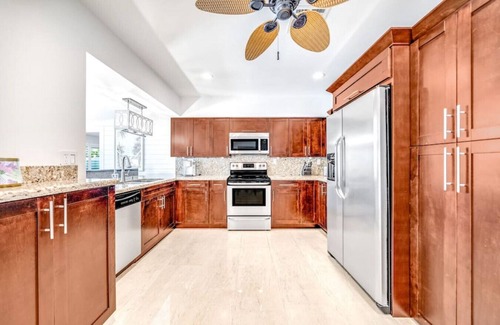 KITCHEN - This kitchen includes granite top bar island with stools, a large beautiful dinner table and chairs, Private Dining room with chairs, all new stainless steel appliances which include the following: Dishwasher, fridge & freezer, microwave, oven, and stove top! This kitchen offers all cooking necessities such as silverware, dishes, pots and pans, glass cups, wine glasses & champagne glasses. Also includes a toaster, Keurig coffee maker, tea maker, blender, barbecue utensils, all commonly used condiments, and all cooking basics! Water Views!