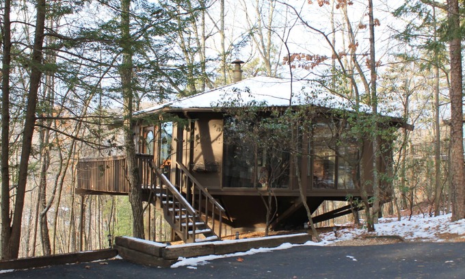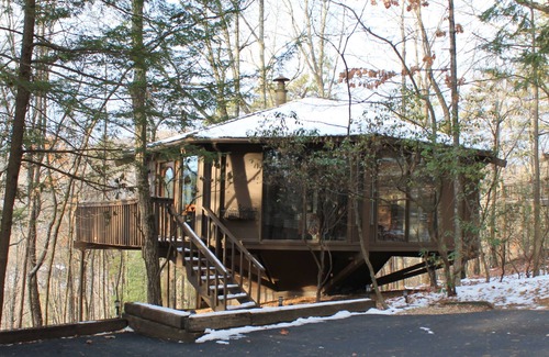 This two bedroom, two bath cabin has been completely renovated and furnished with items that reflect the woodland surroundings . It is a circular cabin completely surrounded in walls of windows with privacy blinds. In each bedroom you will find a comfortable queen bed. The kitchen has new fixtures, cabinets and appliances. Both of the bathrooms are tastefully tiled in natural stone and have new fixtures. You will find rich dark bamboo flooring throughout. There is a 42 inch smart tv in the living room with 50 channels and WI-FI. There is also a 42 inch TV in the master bedroom. Walk outside to find a furnished patio to enjoy the beautiful mountains under a canopy of trees. The cabin comes with complimentary coffee for the traditional coffee maker. The kitchen has all the items needed to cook breakfast lunch or dinner. A roll-away bed is also available upon request for an additional guest. There is a propane grill located on the outside deck. There is a laundry room down stairs, which is has detergent to wash your laundry if needed. There is also a stockpile of hiking gear down stairs that our guests can use. This cabin has TWO dedicated parking spaces directly in front of the cabin.