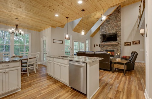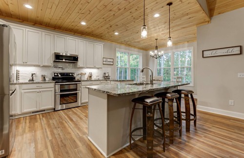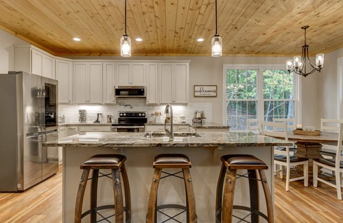Recently constructed in 2021, this cabin epitomizes modern comfort and convenience, boasting a meticulously curated array of amenities to elevate your stay. Immerse yourself in the ambiance of newness with freshly appointed furnishings, gleaming stainless steel appliances, and a fully-equipped kitchen that beckons culinary adventures. Cozy up beside the inviting glow of the gas fireplace, or indulge in entertainment with Smart TVs gracing every bedroom. Embrace the spirit of outdoor living with a Weber grill for sizzling BBQ delights, while the deck and patio adorned in enchanting string lights provide the perfect backdrop for cherished moments under the stars.