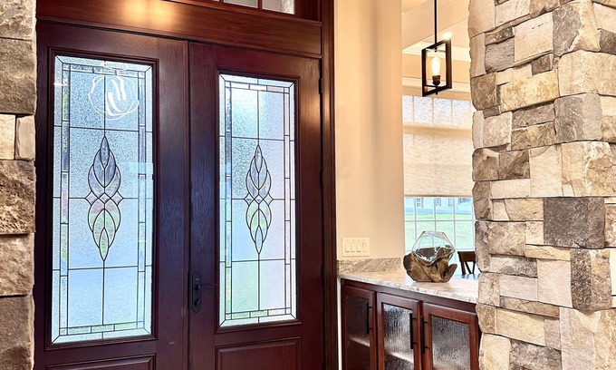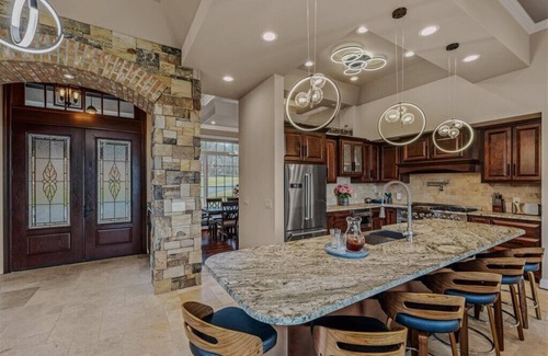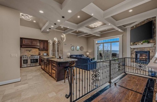 Nestled amidst stunning mountain scenery, this custom home invites you to experience the perfect balance of elegance and natural beauty. As you step through the grand 8' doors, you’re welcomed into an awe-inspiring great room, complete with stone pillars, intricate coffered ceilings, and a striking stone fireplace. A luxurious ambiance is further elevated by an 85" television. There are travertine tile floors that stretch throughout the space with hardwood floors in the dining room and bedrooms. The heart of the home, a thoughtfully designed gourmet kitchen, awaits with top-tier upgrades, while the spa-like shower offers an 8' x 4' haven of relaxation, featuring power jets, a soothing rainfall shower head, and an adjustable handheld option. There are 4 bedrooms, 2 with king-size beds, and the other two bedrooms have unique full-size bunk beds.