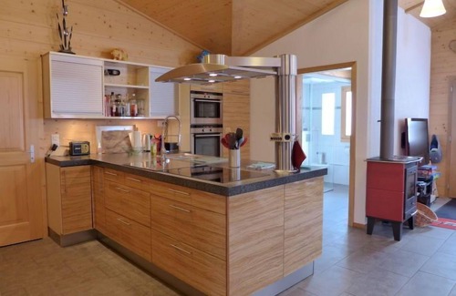 3-room chalet 70 m2. Spacious, very modern and cosy furnishings: open living/dining room with Scandinavian wood stove, dining nook and satellite TV (flat screen), radio and DVD. Exit to the terrace. 1 room with 1 x 3 bunk beds (90 cm, length 200 cm), 1 french bed (140 cm, length 200 cm). 1 room with 1 double bed (160 cm, length 200 cm). Large, open kitchen (oven, dishwasher, 4 ceramic glass hob hotplates, toaster, kettle, grill, electric coffee machine, Capsules for coffee machine (Nespresso) extra, steamer, raclette grill, fondue Set (cheese)). Shower/WC. Floor heating. Wooden floors. Large terrace 50 m2. Terrace furniture, deck chairs, box-room. Marvellous view of the mountains and the countryside. Facilities: washing machine, dryer, children's high chair, baby cot for up to 2 year olds, hair dryer, logs (free). Parking space n 17. Please note: suitable for families. Non-smoking house. 1 pet/ dog allowed. Fire extinguisher.