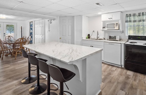 Guests have access to the lower level of the house. Upper level is not open to guests. 2 Bedrooms/ 2 baths. Both bedrooms have access to outside. There is a boat launch on the property, the boat launch is best for jet ski's. The dock includes a covered boat slip. There is no power to the dock.