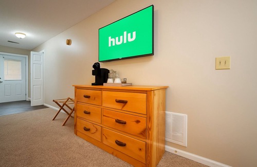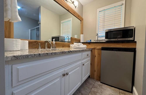 This clean, private studio is designed for convenience. The open floor plan features a king bed, Roku Smart TV, Keurig coffee maker, mini fridge, and microwave — perfect for a comfortable stay between adventures. The full bathroom includes a tub/shower combo, towels, and basic toiletries.