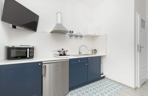 This functional and comfortable studio is located on the first floor of the building. It is designed for two people and features a furnished veranda where guests can find a table and chairs. This cozy and practical dining space is the perfect place to enjoy meals and snacks, or drink your morning coffee in a pleasant atmosphere. The decor of the veranda is dominated by warm shades of beige, brown and gray, while the interior of the apartment is decorated in subdued and elegant colors such as navy blue and white. The living area of the studio has to offer guests a double sofa bed, a dining table with two chairs, a coffee table, as well as a television where you can relax in the evening while watching your favorite programs on terrestrial channels. A roomy closet is also available here, allowing you to comfortably store your brought belongings. Meals can be prepared in the kitchenette equipped with a coffee maker, refrigerator, microwave, induction hob and electric kettle. In the bathroom, visitors can find a welcome toiletries set, towels, a shower and a hairdryer. The common area houses a vacuum cleaner and an iron along with an ironing board.