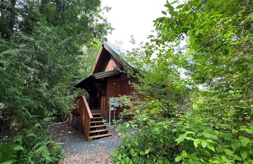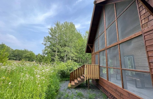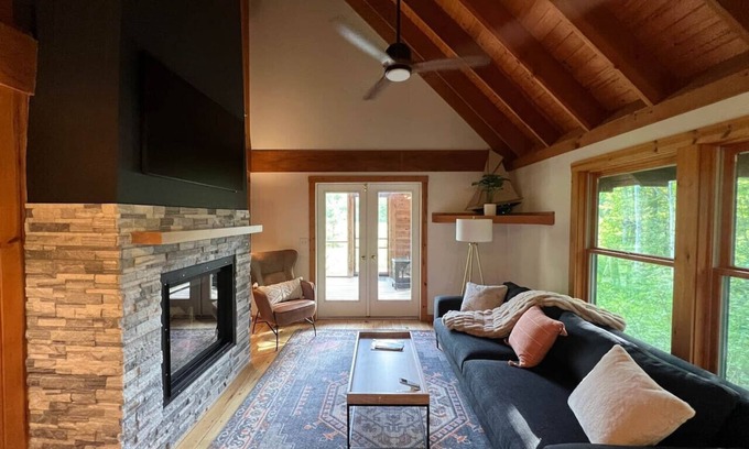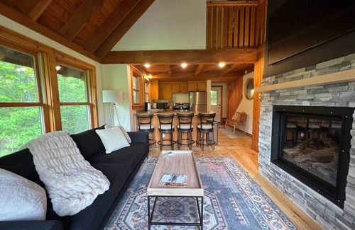 The Hemlock Chalet features a transitional modern aesthetic and open layout. Fully remodeled with serene meadow views from the screened-in porch and brand new furnishings from top to bottom. The main level features a king suite and adjacent bathroom. The screened-in porch has a live edge outdoor dining table perfect for meals al fresco or a game of cards. Situated along an open meadow, you can also enjoy beautiful night sky viewing from the comfort of the porch. Boasting brand-new stainless appliances, the fully-stocked kitchen is ideal for spending evenings in cooking for your guests. The living room has a smart TV and a gas fireplace. On the second level, you`ll find a lofted queen bedroom, writing desk and chair, and newly remodeled bathroom with a soaking tub and honed marble floors.