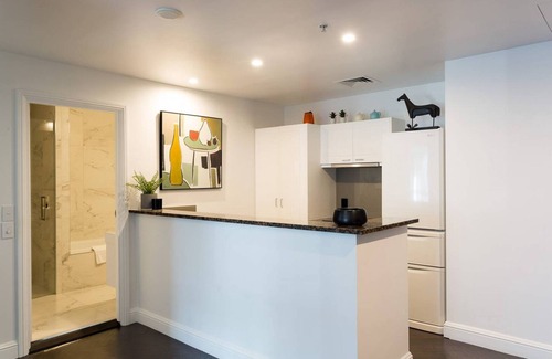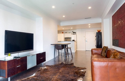 This stylish 1-bedroom apartment has everything you need whether it's for a weekend getaway or a week long business trip. The open plan kitchen looks over the dining and lounge area and you can also sit on the balcony and be the unofficial umpire for a tennis match! The bedroom is just off the kitchen and features a generous king size bed and TV. Relax in the bath with a nice glass of bubbly and unwind from your busy day shopping. There is also a washer and dryer available.