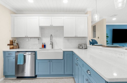 Bright coastal-style living room with sleeper sectional (sleeps 2)