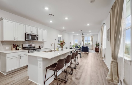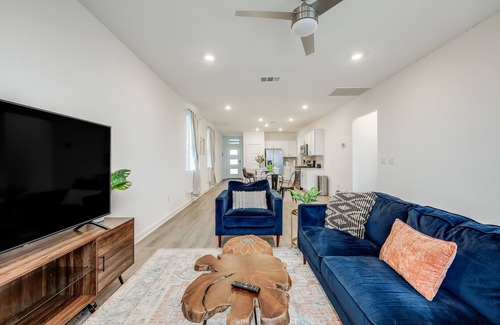 This single-story home features an open floorplan including 3 bedrooms, a large kitchen with an island, a living room, dining space, and a dedicated work area. The master bedroom has an en suite bathroom with a walk-in closet. Free parking is available in the 2-car garage and driveway. Your private, fully fenced backyard offers a view of the Austin skyline and has an elevated patio to relax on. You also have access to in-unit laundry. This home was recently built in 2021 and feels fresh and modern. It is furnished with all the comforts you need to feel right at home.