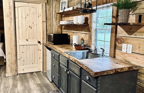 The cabin is very open with a sitting area with large sofa, TV, and high-speed Internet. The kitchenette has a beautiful live edge countertop and comes equipped with a Keurig coffee maker, mini refrigerator, combo microwave/air fryer/oven, and a hot plate for all of your needs. There is a queen sized bed, with convenient outlets located in the headboard, making it easy to keep your devices charged overnight. The sofa has a sofa bed that pulls out to accommodate additional guests. We provide towels and soap and shampoo for the shower.