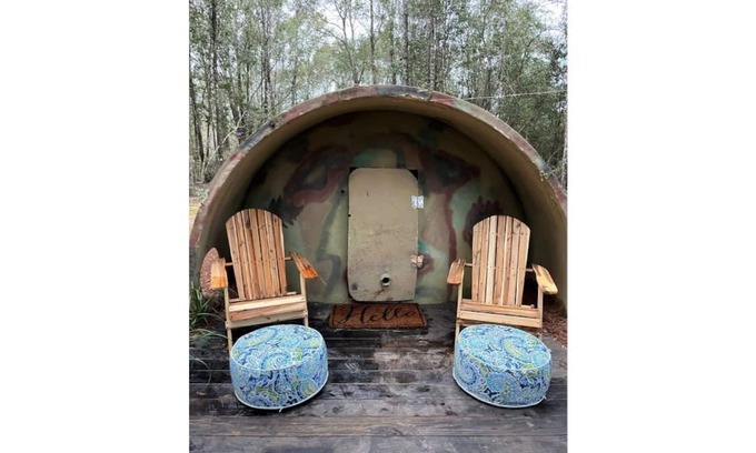 Enjoy the sounds of nature and our farm when you stay in this unique setting located on 30 acres. This 20’ long round bunker is half buried in ground and has been converted into an off grid experience. With a composting toilet, power station for small items such as cell phones, rechargeable lanterns and a potable 5 gallon sink system you’ll be comfortable in this little getaway. Queen size bed for two and a thick foam mat for an extra guest allows this unit to sleep three. Comes with firewood!