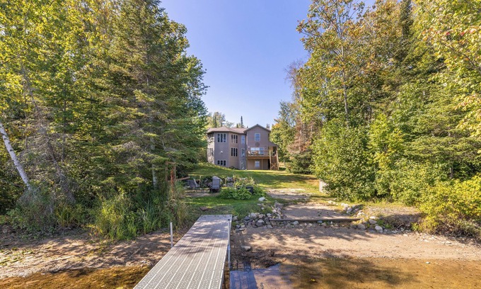 Backyard gradually leads you to the fire pit with chairs (firewood onsite for guest use included), kayaks and life jackets for guest use in the shed, sandy beach area, and dock off the shore during summer months.