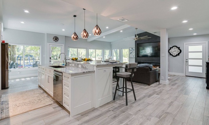 Welcome to Grayson Grove! This 30 acre property is a hidden gem just outside of Sherman. Tx. If you want seclusion and comfort but easy access to all of the amenities of a modern city this is an ideal place for you! This newly remodeled home has 4 bedrooms, 31/2 bathrooms. You can easily accommodate 9-10 people with a large open concept kitchen/tv. There is a stocked fishing pond and a playground hidden in the woods with amazing walking trails. As well as a hot tub to relax and enjoy the stars.