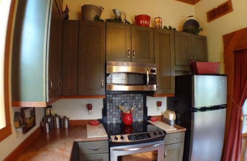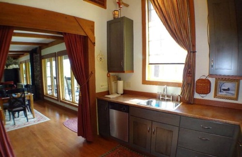 Enjoy our three-level, custom-built mountain cabin. Every space has been designed in unique and wonderful ways, to maximize its use! Details like vaulted metal ceilings, amazing custom lighting, audio speakers in virtually every room, fully stocked kitchen. And then the amazing outdoor areas, with the wrap around deck equipped with four steam bent rocking chairs, table and chairs with umbrella shade, and that amazing 5-person hot tub. With the 4-burner grill and the rustic fire pit - you'll find you have it all at Awenasa!