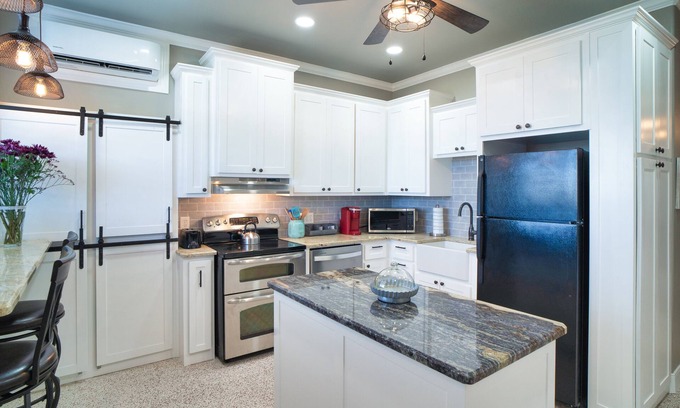 The kitchen offers plenty of cabinet space that is well stocked with amenities. There are granite counter tops, a front apron farm sink, dishwasher, microwave, double oven & refrigerator. The kitchen also has a granite bar top, with two bar stools, and a large window to watch the sunset. Additionally, there is a center island with a granite top for food prep and pull out trash can.