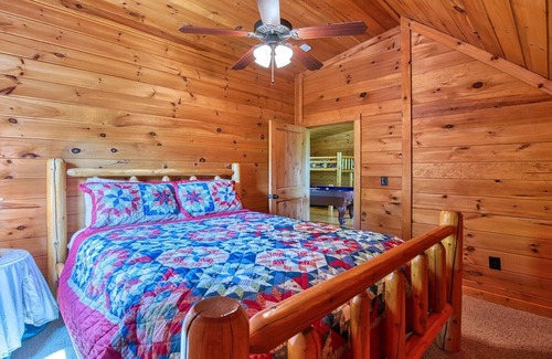 Entering the upper level, you will immediately feel welcomed by the game room complete with pool table, bar area and a twin over full bunk area. Also on the upper floor is the queen master suite with master bath as well as an additional queen room.