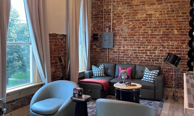 Discover this unique pet friendly apartment located in the Neville Building in the heart of Horse Cave Ky. This beautiful apartment features 1 king bed and 1 twin bed, and the couch pulls out to a twin bed. Perfect for 2 adults and 2 kids. If you like vintage and modern decor you will love this apartment. Most of the decor is music inspired . You must be able to walk up 23 steps while looking at a wall mural painted by a local artist. Enjoy the Park Views of Hidden River Cave. and 9.5 miles from Mammoth Cave National Park. Experience the magic of Horse Cave at our downtown apartment.