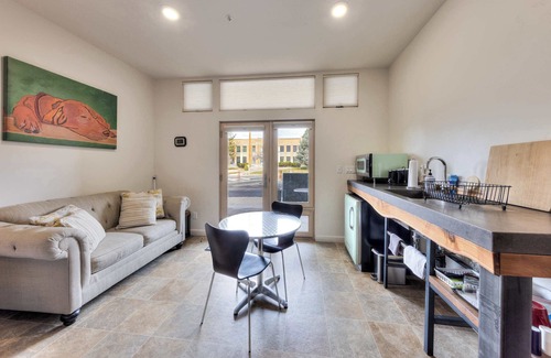 Center Street Suite #1 is a lovely, centrally located spot to spend your vacation. This suite is much bigger than most hotel rooms, has its own entrance from the street with a private patio area and is very quiet. The bath features a large walk-in shower, oversized vanity and the essentials (shampoo, conditioner, body wash, lotion, etc.) The suite has a king size bed and spacious closets For your enjoyment a flat screen smart TV with WIFI streaming apps are available. The mini kitchen has a fun, retro styled, fridge and microwave, plus a coffeemaker and dishes, enough for simple food prep if you don't feel like going out to one of our many great local eateries within walking distance for take out or dine-in with indoor and outdoor seating.