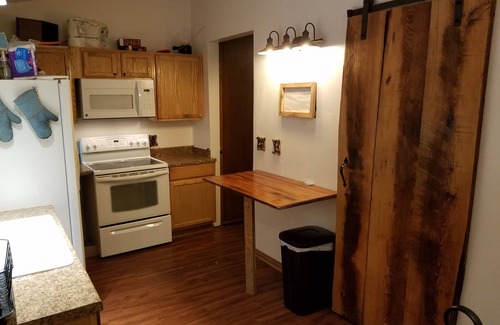 A down to earth 4 bedroom, 2 bath home nestled in the woods that features 2 large gathering rooms (one is a theater room) and a huge covered front porch. There is a full kitchen and two separate eating areas. We also have an external gameroom/hangout in our big red barn called the Hideout Saloon.