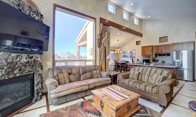 Amenities include a fully equipped kitchen, 3 gas fireplaces (living room and both bedrooms), southwest furniture, new comfy pillow-top mattresses, memory foam bunk mattresses, Weber Silver gas grill, quality linens, towels, washer/dryer, central air/heat and WiFi. The living room has a 60” smart flat screen HDTV, sound bar and subwoofer, SMART Blu-ray disc player and a good selection of movies. Also has new overstuffed southwest love seat and a leather queen sofa sleeper. (a memory foam topper is provided for extra comfort). The living room and dining room views are spectacular. They are not obstructed by other buildings in the complex. The master suite has a 55” flat screen SMART HDTV. It includes a large spa-like bathroom. You can enjoy the large soaker jetted tub/shower, complete with shower and rain heads. Also, relax, soothe sore muscles & joints and let stress fade away in your very own sauna with our Sauna Room. Who knew you could enjoy the benefits of a spa experience during your stay in Moab. The bunk/queen room has twin over twin custom bunk beds and a custom made Queen bed- 55' smart HDTV, built in book case with some movies and a fireplace. The outdoor patio area is one of the largest in the complex. It includes a large outdoor kitchen complete with natural gas grill to use for that favorite grilled meal, a burner, small fridge and sink. There are 2 outdoor tables that seat 8 for your outdoor dining or just relaxing, visiting and enjoying the views. Lounge chairs are also provided end for relaxation and taking in the sun. It's here and ready to use PRIVATE 7-8 person hot tub! Also on-site, you'll find a community hot tub open year round and large outdoor swimming pool open April through October. 10:00 AM – 10:00 PM.
