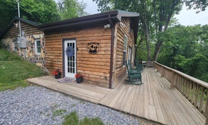 This warm and cozy log-and-stone style cabin is located high in the Blue Ridge mountains at around 3,000 feet elevation. It is in the same area as the Shenandoah National Forest and this property borders the park land. Come and "get away from it all" in the mountains while not giving up any of your modern comforts! You may not see another human being for a half mile in any direction, but you'll see plenty of deer, bear, and wildlife! Inside the cabin, you'll find spacious living areas, comfortable bedrooms, a fully stocked kitchen, and large HD televisions.