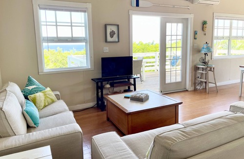 The large, open-plan living area is airy and cool thanks to its high ceilings and many windows. There is AC in the living area and both bedrooms as well as ceiling fans. Enjoy your meals on the 400 square foot wrap-around deck with two sets of French doors opening onto the deck. With the cool sea breezes, you can watch the waves breaking at James Point, fishing boats from Harbour Island, or a cruise ship sailing past.