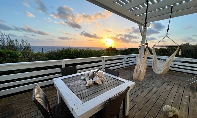 High Seas is a spacious, hilltop 2 king size bedroom, 2 bathroom cottage with wonderful views over the blue Atlantic waters. Whether sitting on the deck or inside the house you have a view of the water. Make a coffee using the Keurig or drip coffee machine and watch the sunrise from the deck or lounging on the sofas inside the great room.