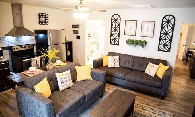 This duplex is such a great alternative to a hotel. You'll have a space that feels like a home. It has a full kitchen with all the basic cooking essentials, a full bathroom, two TVs, a utility room with a washer & dryer, as well as a desk for working... if you must. There's also plenty of parking for those pulling a boat, an RV, or U-haul.