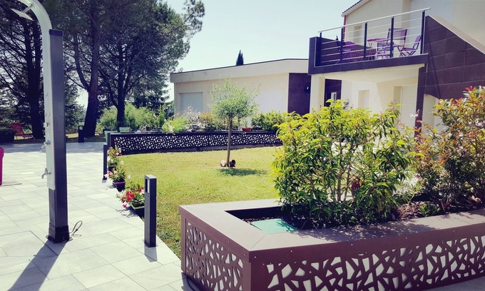 Large terrace with a large heated outdoor swimming pool on a 4,000 m² plot with umbrella pines and fruit trees.
