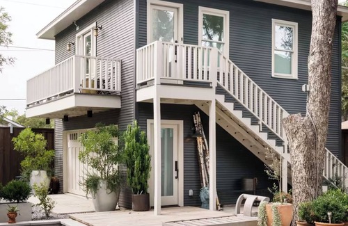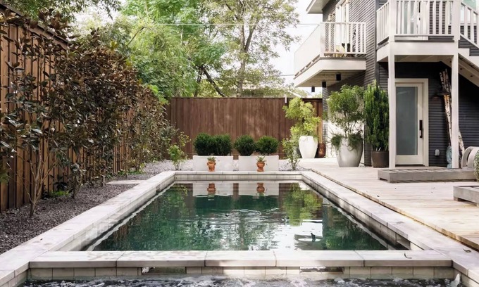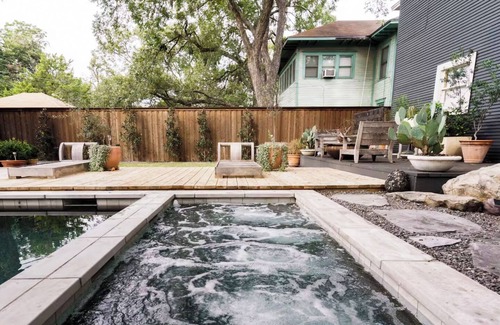 Gorgeously appointed upstairs guest apartment, surrounded by trees in historic neighborhood close to Bishop Arts/Downtown. A private balcony overlooks a shared backyard oasis where pool and hot tub are lit beautifully by night. The owners are both in the creative industry and have created a designer space that will leave you inspired.