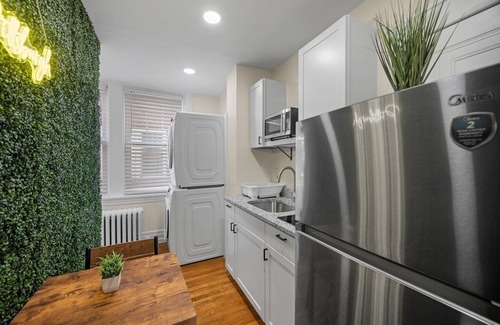Enjoy a king-size bed, sunroom with a foldable sofa, full kitchen, new bathroom, and in-unit washer & dryer. Large windows fill the space with natural light. Safe, stylish, and inviting!