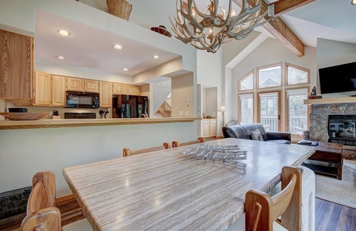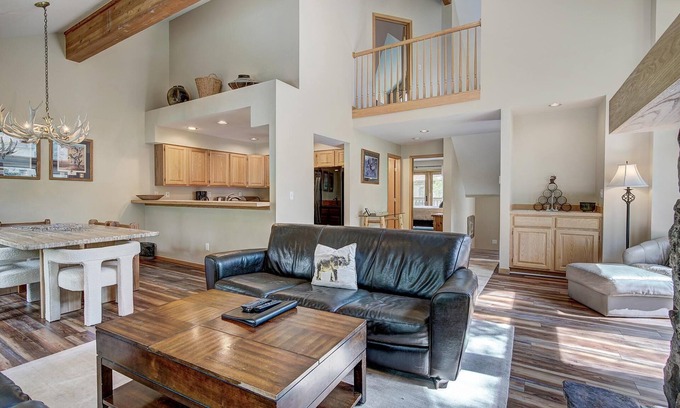 The main level of the home offers even more space for relaxation and entertainment. The queen bedroom, complete with a private balcony and flat-screen TV (for DVD/Blu-Ray only), has an en-suite bath for added privacy. The open floor plan connects the fully outfitted kitchen, dining area, and living room, making it easy to gather together. The living room features a gas fireplace and plenty of seating, perfect for enjoying a movie on the large screen TV or chatting with those preparing dinner in the kitchen. Step outside onto the expansive deck, where a private hot tub awaits to help you unwind after a thrilling day in the mountains. If you prefer, take a short walk or drive to the Upper Village pool and hot tubs for additional relaxation.