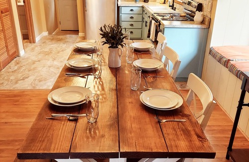 Soaring tongue-and-groove, exposed log-beam vaulted ceilings welcome you as you enter the main living space off the covered deck. The fully-equipped kitchen, dining room and main living spaces all flow together for a roomy, light and open floor plan. Big 55” LED TV for viewing your favorite shows/movies. The large wood-burning fireplace is a definite focal point and perfect for gathering around during those cooler months.