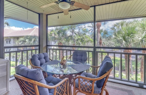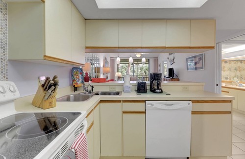 You will enjoy the vaulted, open living room/dining space with comfortable furnishings, large TV with community provided Hotwire cable programing, and dining table with seating for 4. Large sliding glass doors opening to the fully screened balcony surrounded by trees, and a dining table with seating for 4.