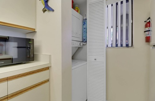 Kitchen with full-sized appliances, stackable washer/dryer, cookware, dinnerware, drip and Keurig-style coffee maker.
