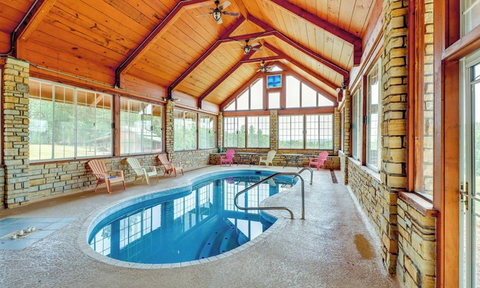 If your perfect getaway involves the great outdoors, this essentials-only 1-bathroom studio in Shirley, AR, is your ideal retreat! Set on 366 wooded acres, this vacation rental offers a tranquil escape for couples or small families. Explore the on-site trails, fish in the 5-acre lake, or soak in the scenic views. Come evening, prepare a delicious dinner in the shared smokehouse or swim in the indoor pool!